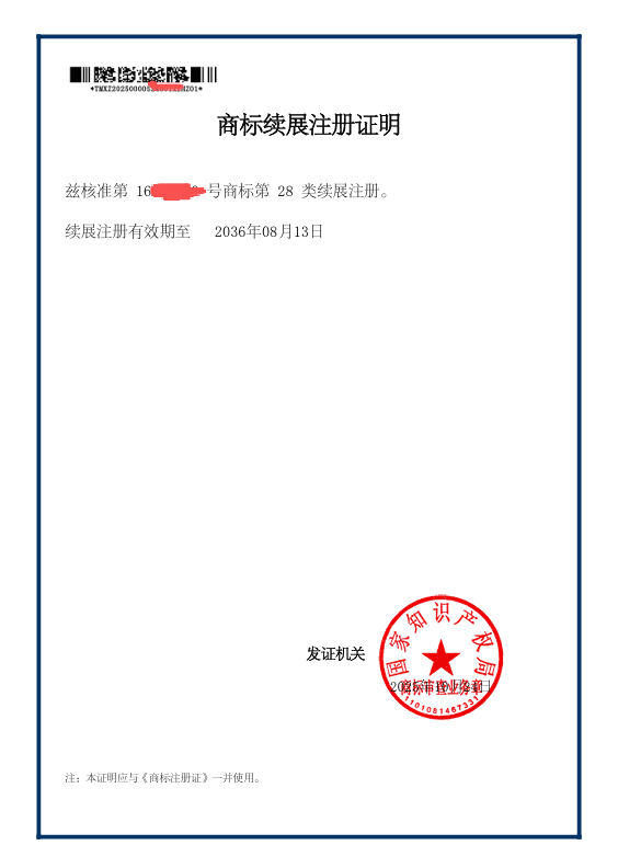 • Certificate of Trademark Renewal (official)
